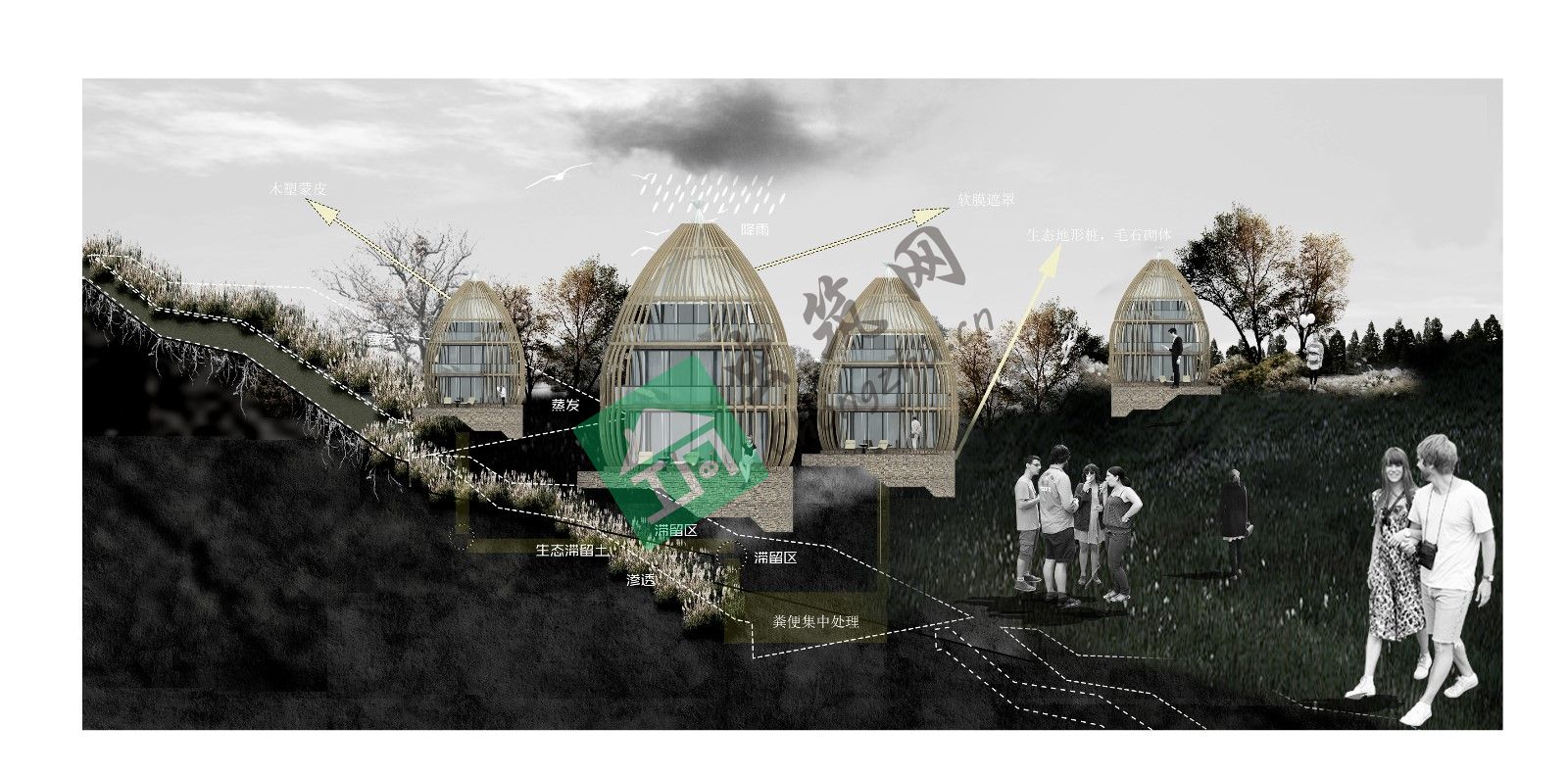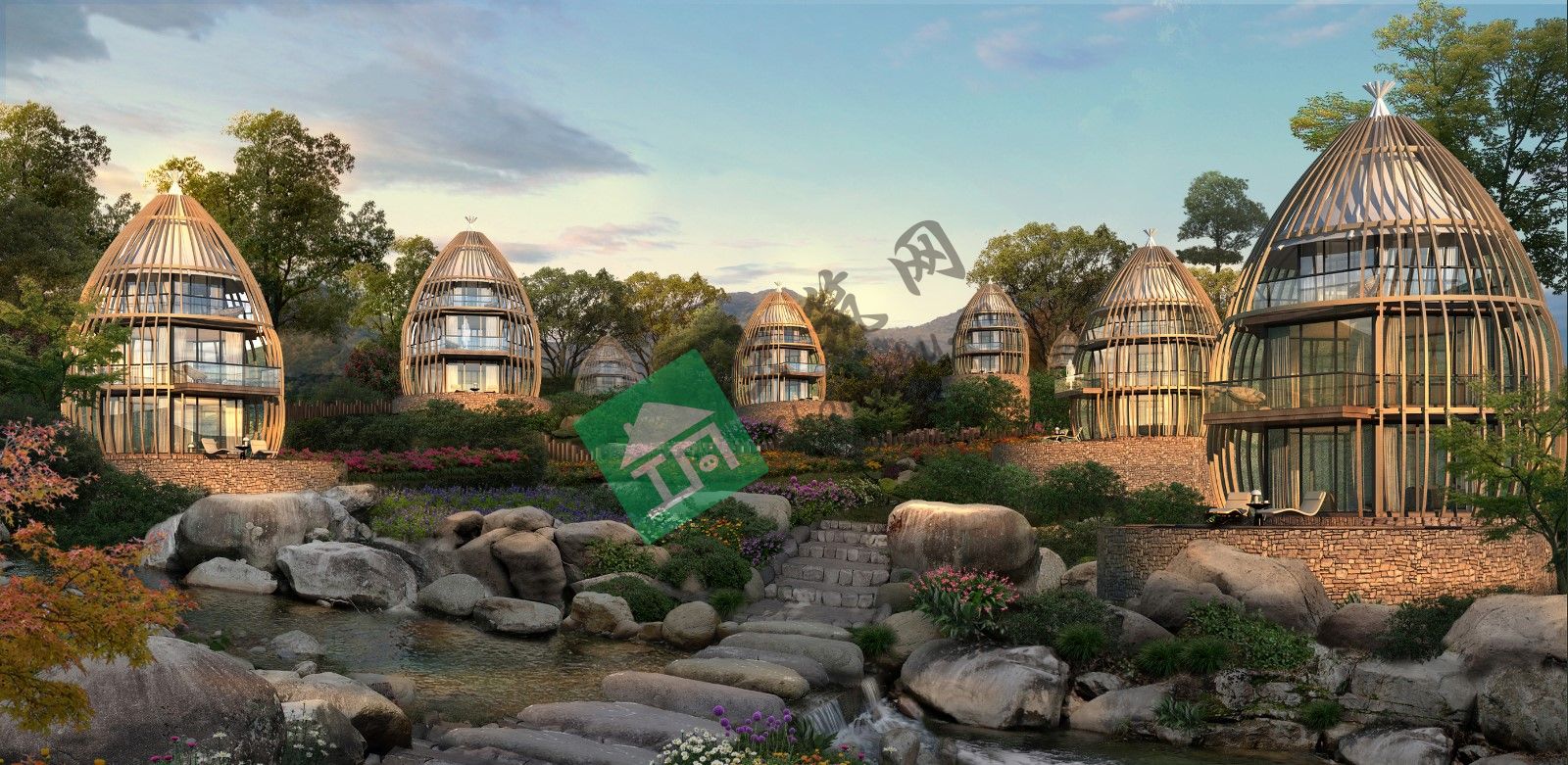 本案以“巢居”命名,主要表達(dá)出賓至如歸的主題思想,建筑與環(huán)境之間的和諧關(guān)系不是建立在模仿的基礎(chǔ)上,而是由一種截然相反的同源性來(lái)定義的。這些小的、獨(dú)立的單位被安置在環(huán)境周?chē)?,它們是景觀中的一個(gè)重要節(jié)點(diǎn),與自然共同形成一個(gè)持續(xù)的有機(jī)環(huán)境。