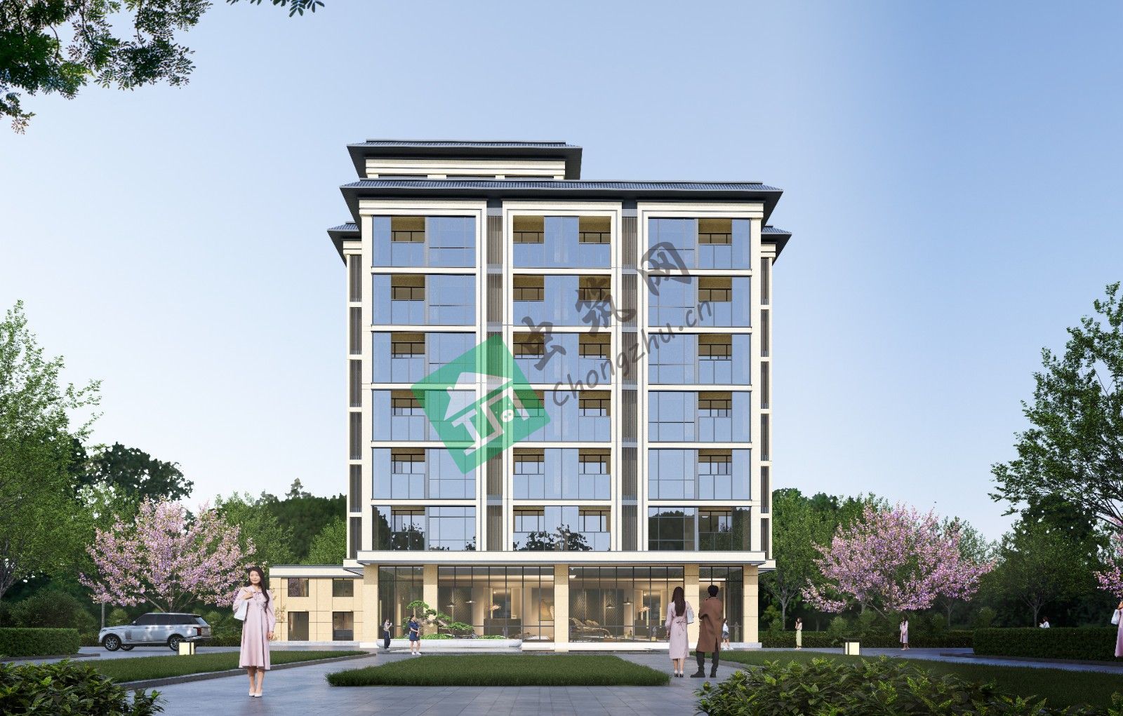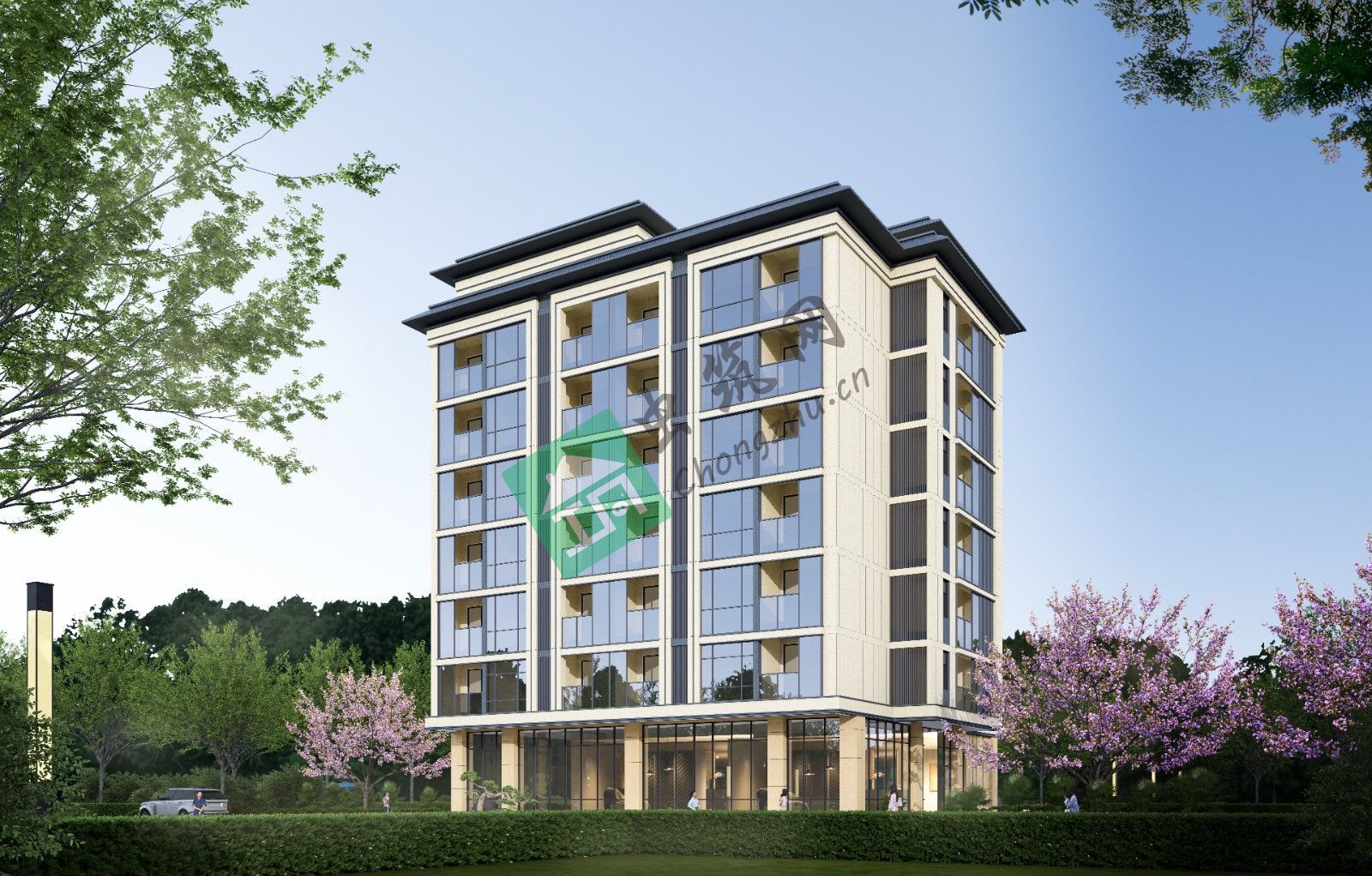 單體建筑采用現(xiàn)代簡約融合地域特色的風格,立面以淺米色與深灰色為基調,搭配大面積玻璃幕墻,塑造簡潔、通透的視覺效果,呼應山林間的清朗氣質。建筑形態(tài)規(guī)整中求變化,通過退臺、錯層設計,豐富天際線,同時為上層客房創(chuàng)造觀景露臺,拓展室內(nèi)外空間互動;底部架空層削弱建筑體量感,引入綠化與休閑功能,讓建筑更好地融入環(huán)境,兼具美觀與實用性。