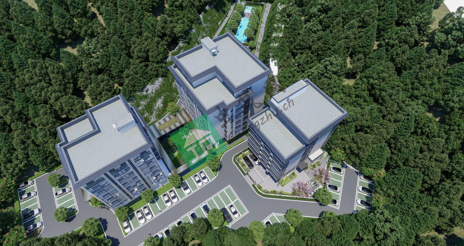 秉持生態(tài)優(yōu)先理念,場地綠化延續(xù)周邊山林脈絡,保留原有植被基礎上,補充鄉(xiāng)土植物,構建層次豐富的生態(tài)綠帶。溫泉區(qū)結合水體打造親水景觀,景觀湖與泡池區(qū)形成?“藍綠交織”?體系,既優(yōu)化微氣候,又為住客提供觀水、戲水的休閑場景;酒店建筑周邊以組團綠化、庭院景觀營造私密且親近自然的居住環(huán)境,讓生態(tài)景觀貫穿規(guī)劃始終,成為項目特色名片。